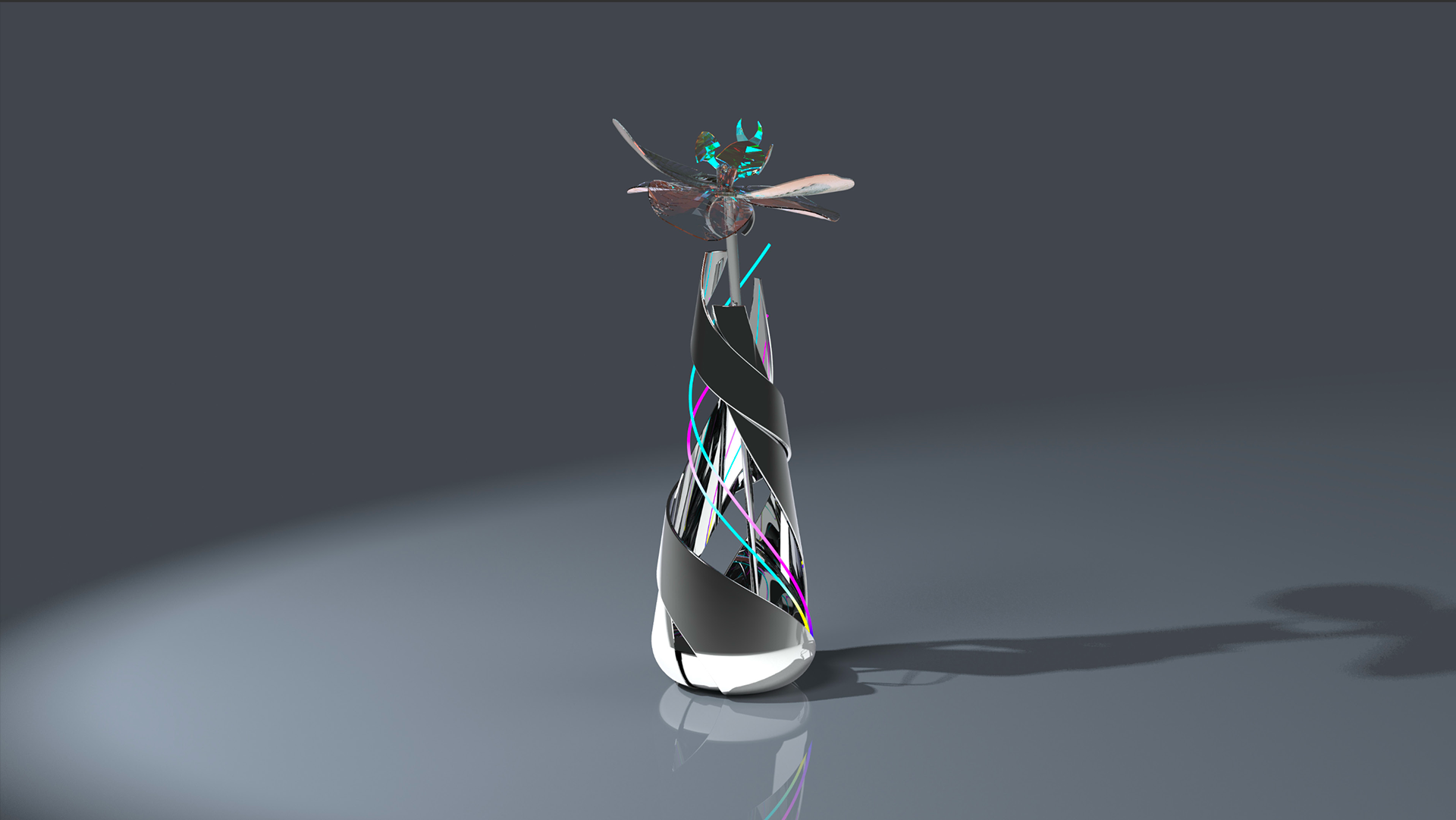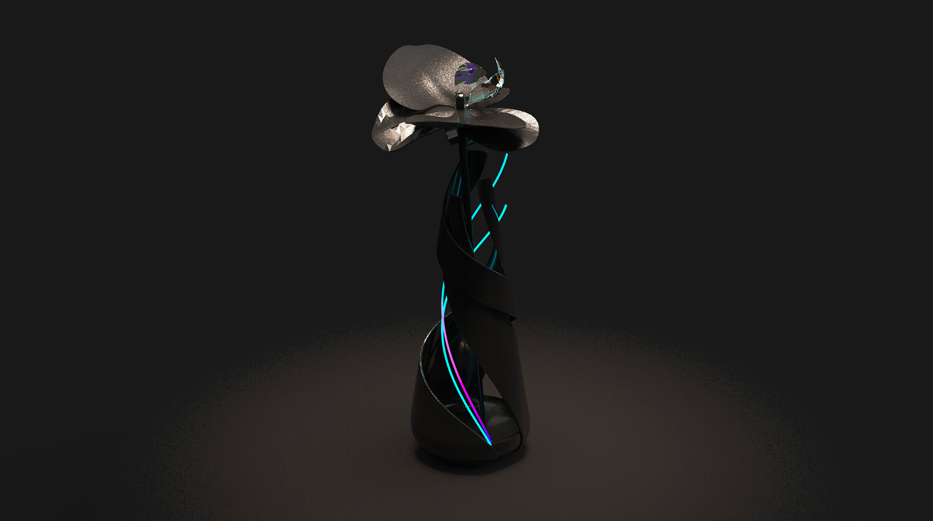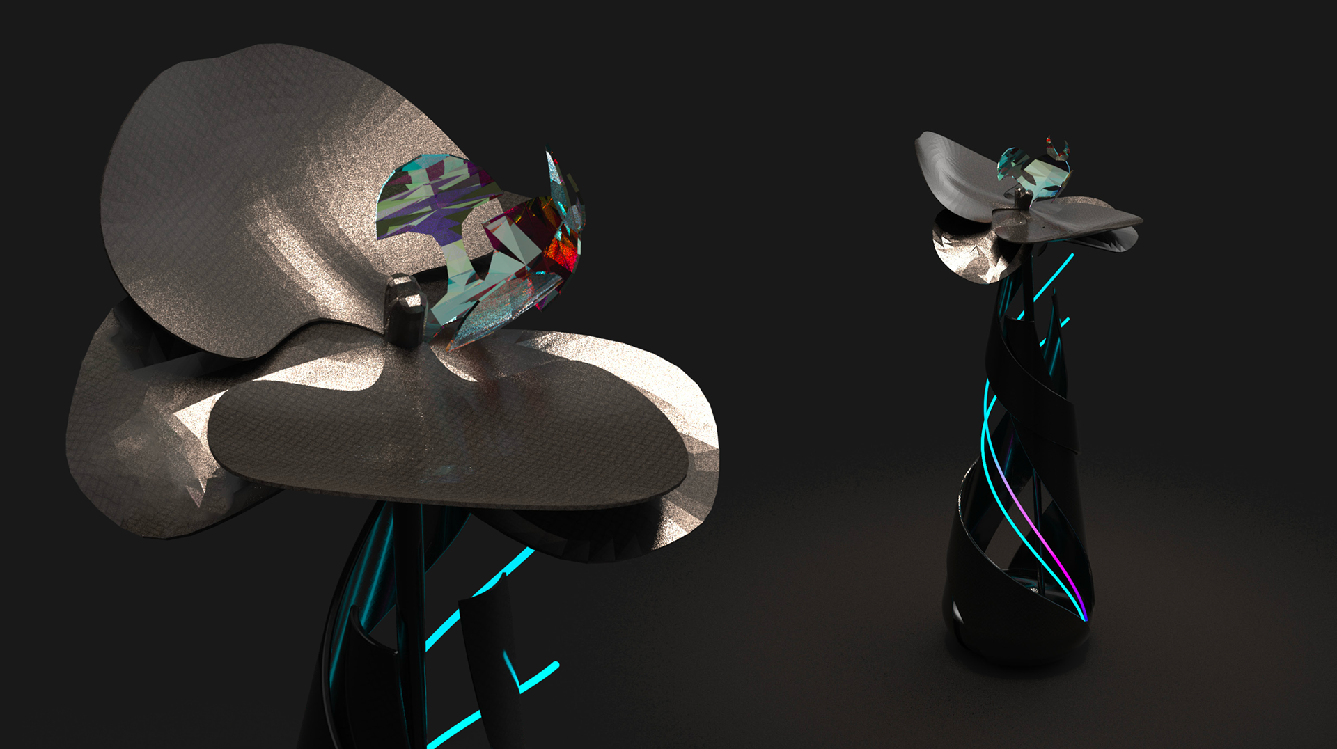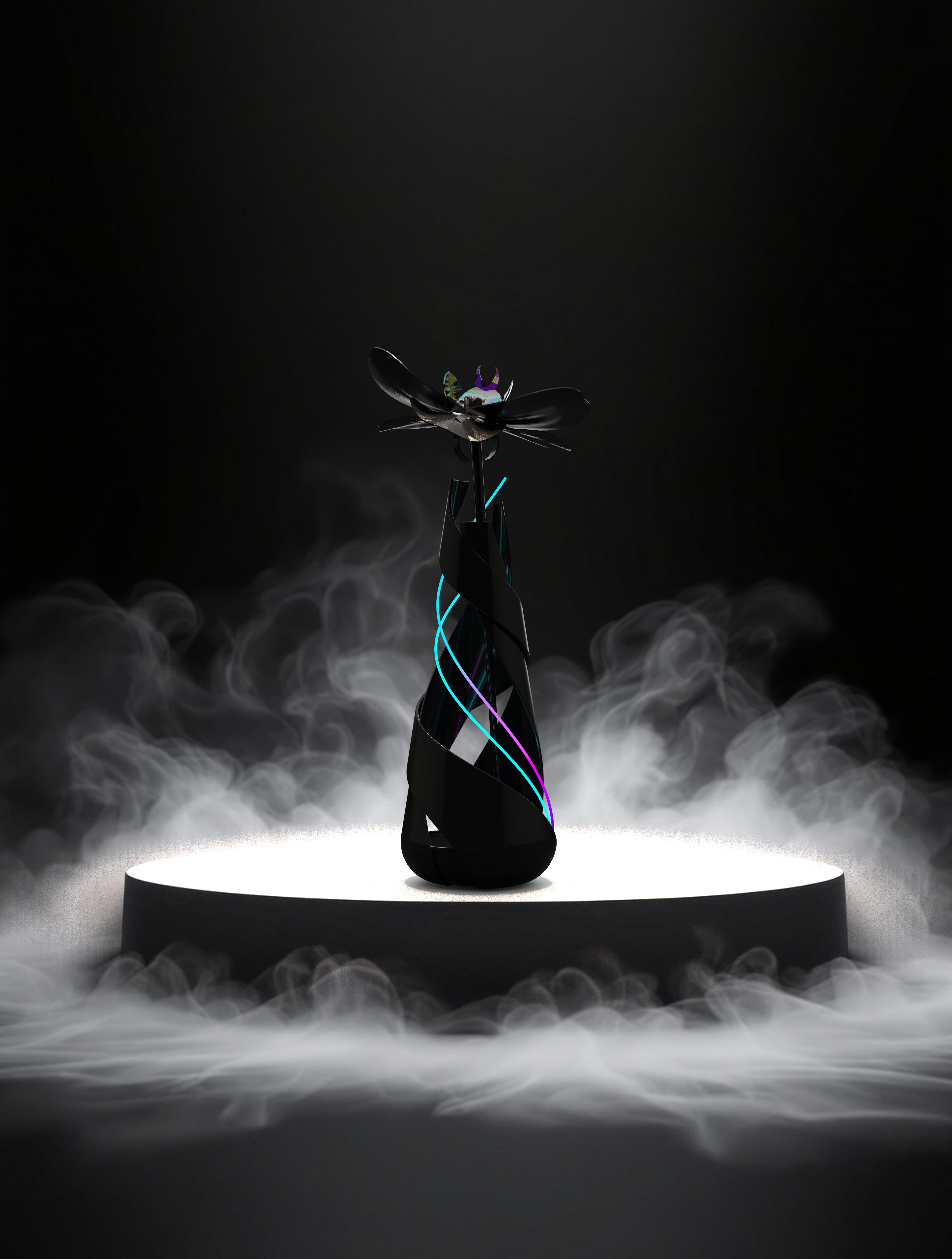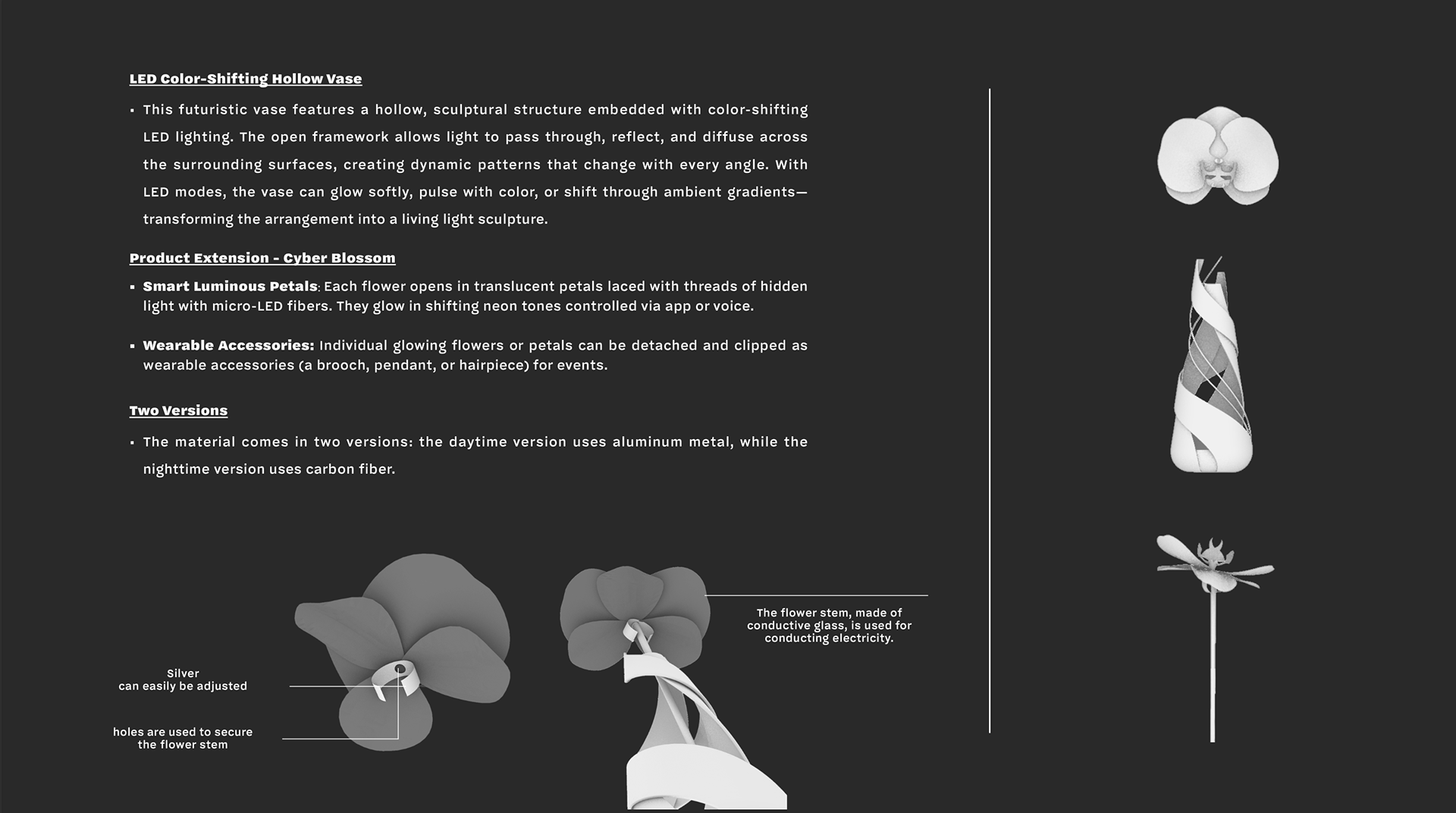 We create modular, color-shifting luminous vases and wearable floral accessories that